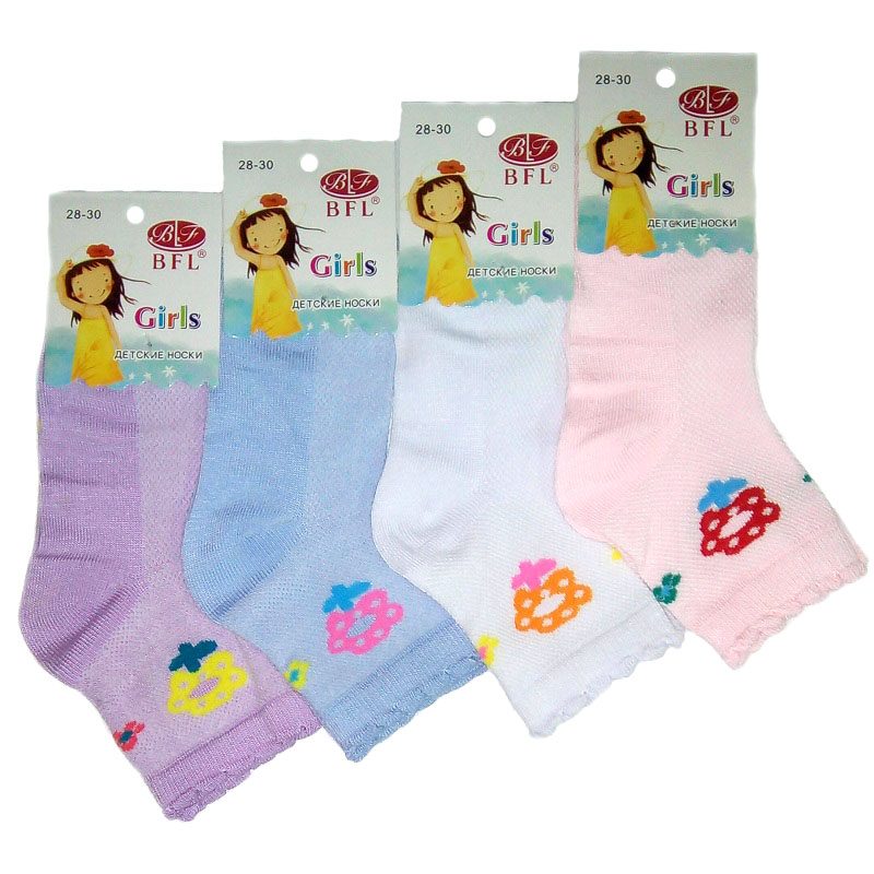 Носки на девочек выполнены из хлопка с добавлением эластана. Подошва гладкая, верх в сеточку, на паголенке рисунок, резинка двойная и ажурная.