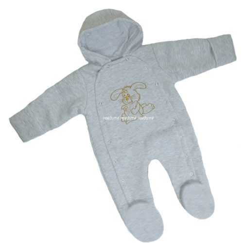 Комбинезон с капюшоном, спереди два ряда кнопочек до конца каждой ножки, с закрытыми ножками.