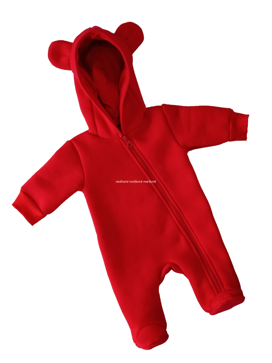 Комбинезон выполнен из футера двухнитки с начёсом. Спереди косая молния, капюшон на подкладке. У комбинезона закрытые ножки, на рукавах манжеты.